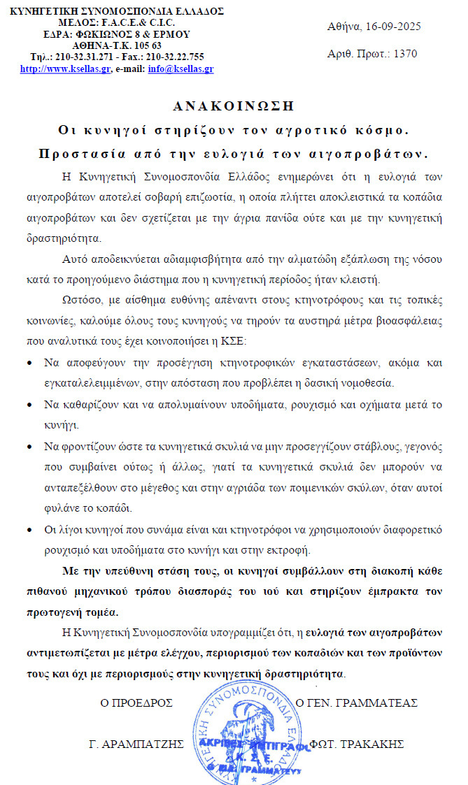 Η Κυνηγετική Συνομοσπονδία υπογραμμίζει ότι, η ευλογιά των αιγοπροβάτων αντιμετωπίζεται με μέτρα ελέγχου, περιορισμού των κοπαδιών και των προϊόντων τους και όχι με περιορισμούς στην κυνηγετική δραστηριότητα.